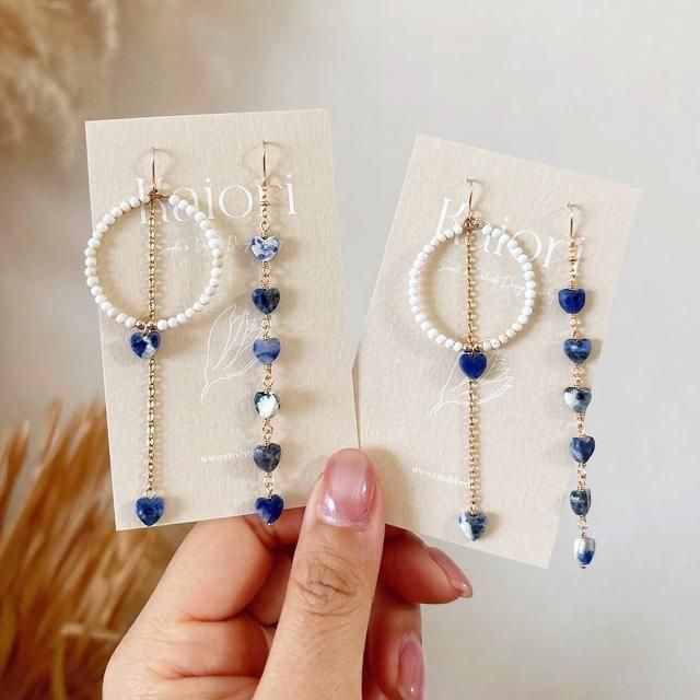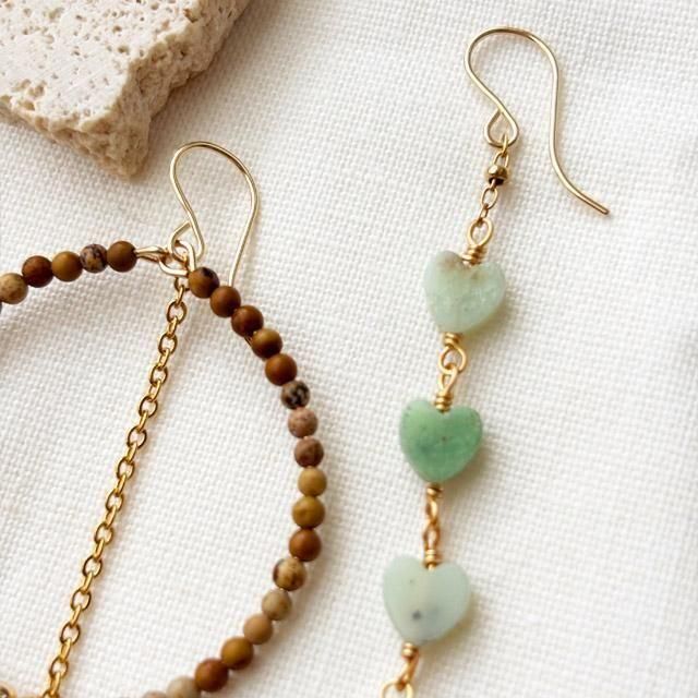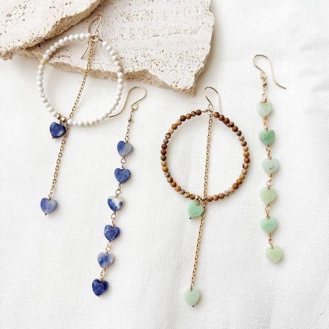 とても小ぶりなハートシェイプのストーンを、ロングとフープデザインでアシンメトリーに仕上げました。