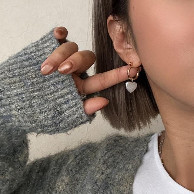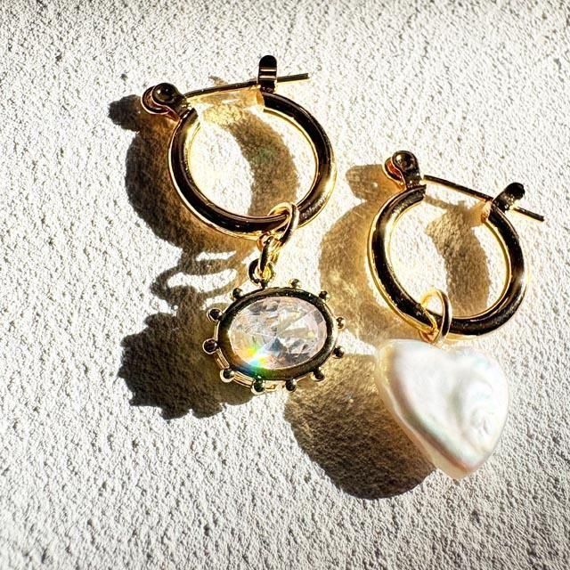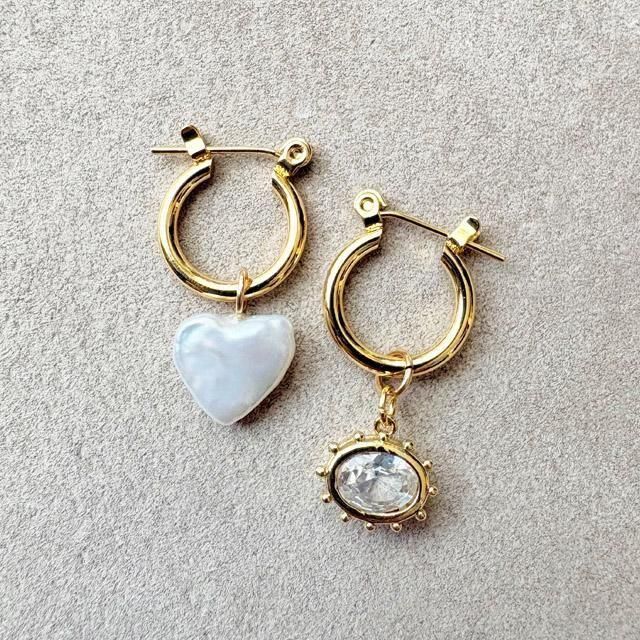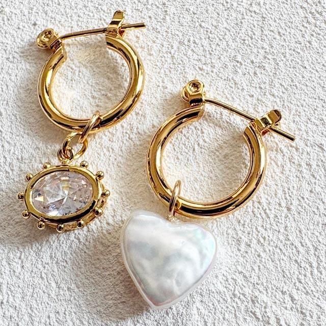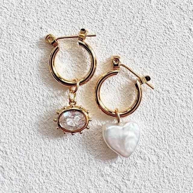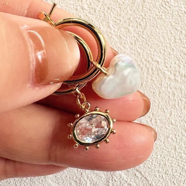 可愛くなりすぎないハート型の淡水パール、キラキラ煌めくつぶつぶ枠留めデザインのCZチャームのアシンメトリーピアスです。